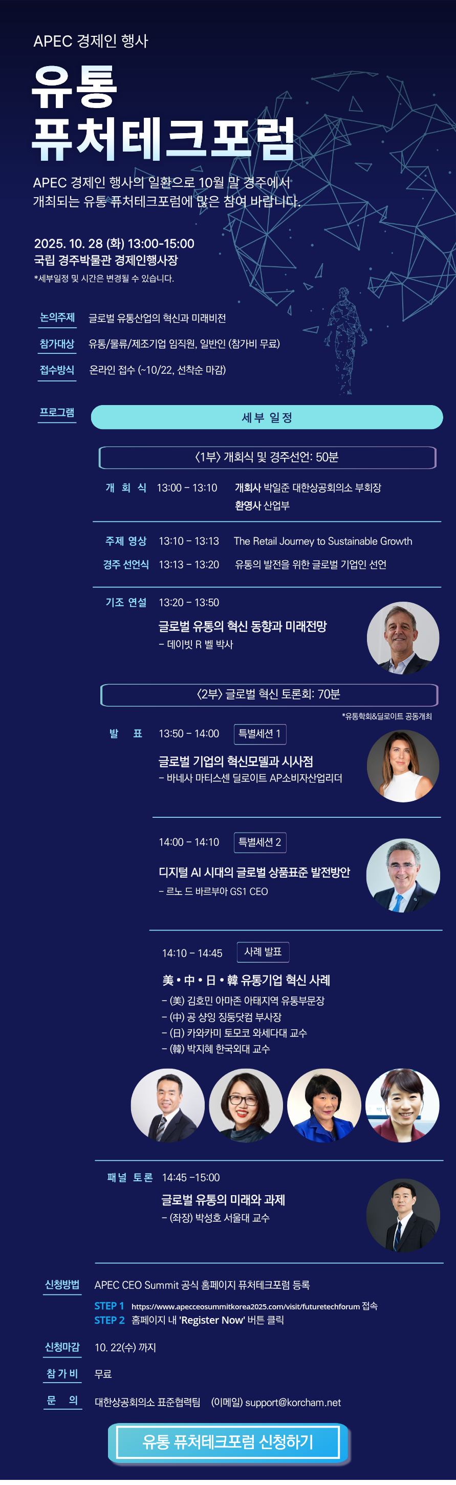 2025 APEC 유통 퓨처테크포럼 가. 유통 퓨처테크 포럼(FutureTech Forum) 개요 - 일시·장소 : 2025. 10. 28(화) 13:00∼15:00, 경주 국립박물관 - 주요내용 · 글로벌 유통의 혁신 동향과 미래전망(David.Bell 와튼스쿨 석좌교수) · 국내외 주요기업 혁신 사례 : 아마존, 징둥닷컴, 롯데백화점, 현대백화점, 쿠팡, GS리테일 등 - 퓨처테크 포럼 등록 https://www.apecceosummitkorea2025.com/visit/futuretechforum