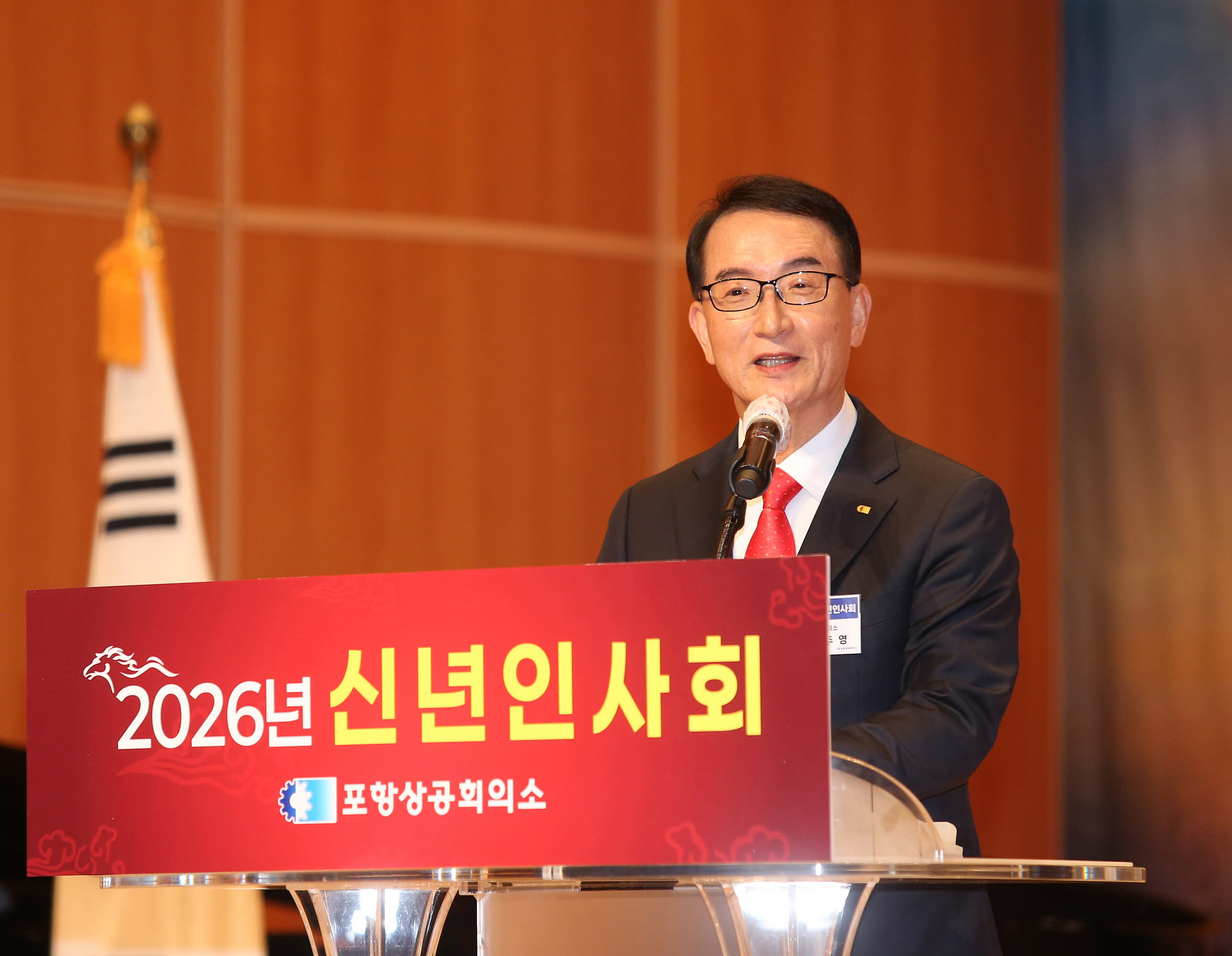 포항상공회의소(회장 나주영)는 1월 5일(월) 오전 10시 효자아트홀에서 이강덕 시장, 최영숙 환동해본부장, 김일만 시의회 의장, 김정재 국회의원, 이상휘 국회의원, 최나영 지청장, 전익현 철강공단 이사장, 박남식 제철소장 등 지역 주요기관⋅단체장, 도의원, 시의원, 상공의원, 기업체 대표 등 500여명이 참석한 가운데 「2026년 신년인사회」를 개최하였다.
